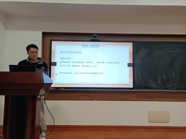 物理学院毕业生马琨傑已签约中国电子科技集团公司第五十五研究所,他以自己的亲身经历面向低年级同学现身说法,介绍了心得体会。首先,在研一时从自己的性格测试情况、兴趣岗位匹配度、专业以及行业前景等多个角度综合考量就业方向,从国防单位、互联网企业、政府及事业单位、自主创业中锁定了国防就业;其次,在研二抓住了每个假期的时间进行实习,介绍了自己先后实习的三个单位及岗位的具体情况以及联系方式;最后,在研三一开学就积极投入的学习面试技巧,了解无领导小组讨论、群面、单面注意事项等。