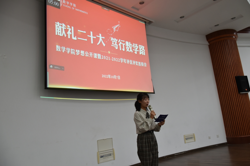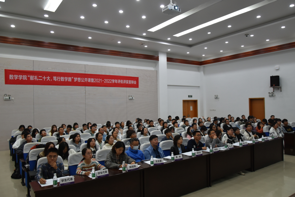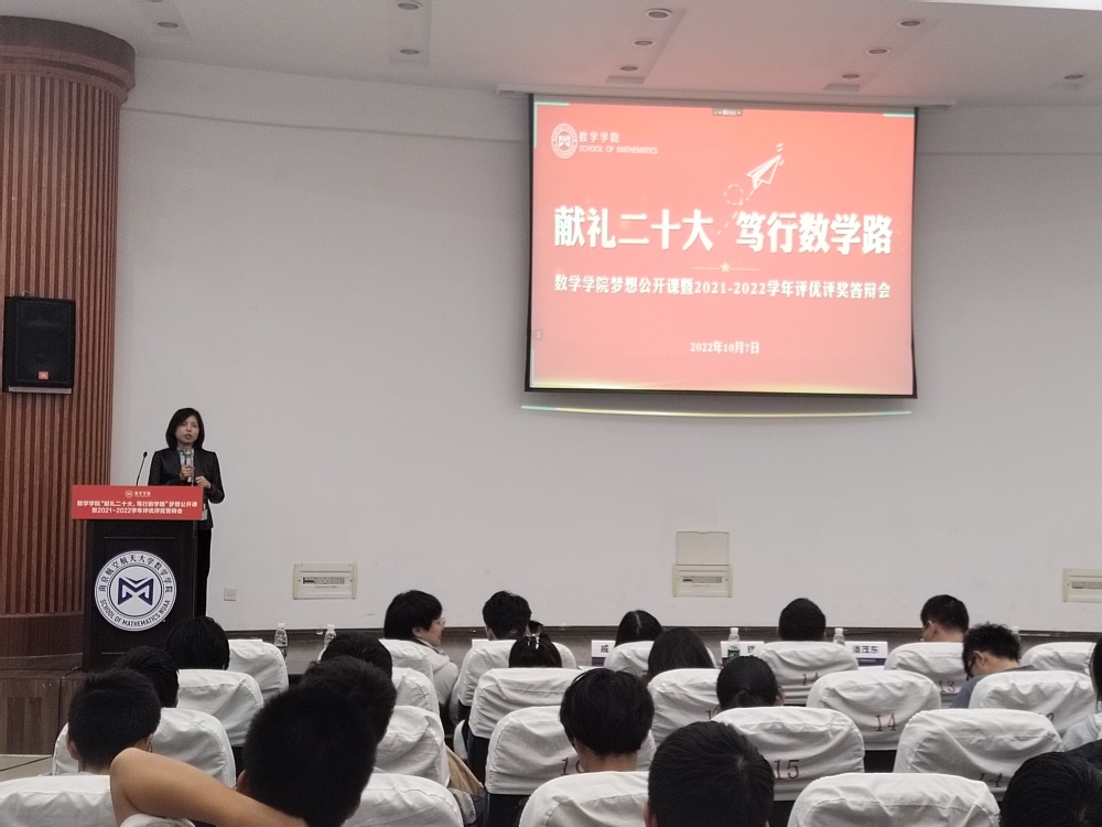 二十大即将到来之际,为了充分发挥榜样育人作用,用身边的榜样激励更多同学见贤思齐、矢志奋斗。10月7日晚7点,betway西汉姆联于理学楼报告厅举办“献礼二十大,笃行数学路”梦想公开课暨2021-2022学年评优评奖答辩会,参加此次活动的评审有betway西汉姆联党委副书记周佼佼,院长助理、0822101班班主任潘茂东,信息与计算科学专业负责人王正盛,应用统计学专业负责人蒋辉,数学系系主任曹峰,教学办主任陈陆陆,团委书记戚月,2019级辅导员胡诗帆,2020级、2022级辅导员陈越及两名学生代表。活动由学院2022级新生闻敏含主持,2022级全体本科生到场学习。