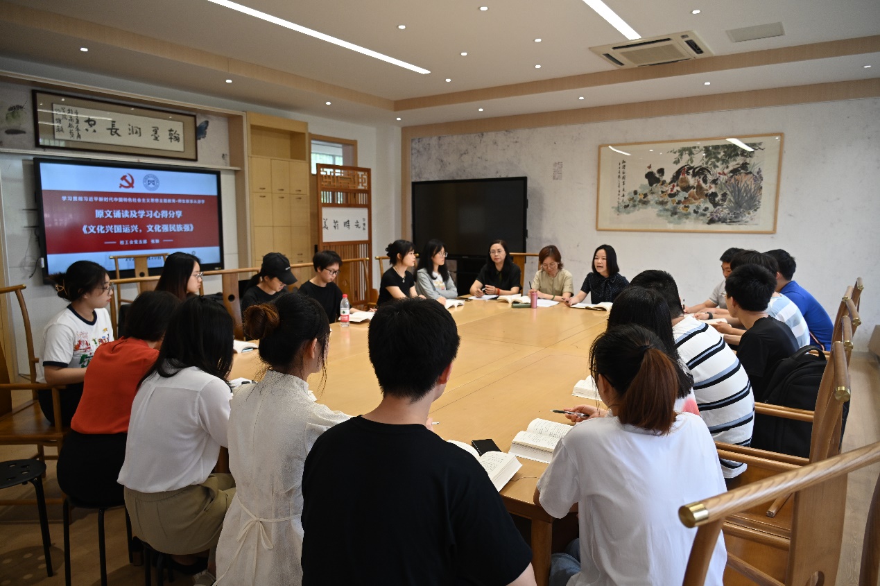 余春玲首先领学习近平总书记在文化传承发展座谈会上的重要讲话精神。她重点围绕“深刻认识中华文明的突出特性”带领两支部师生党员进行学习,详细阐释中华文明具有突出的连续性、创新性、统一性、包容性、和平性,鼓励师生党员们认真学习领会习近平总书记重要讲话精神,进一步坚定文化自信,担负起新的文化使命,努力为推进中华民族现代文明和社会主义文化强国建设贡献力量。