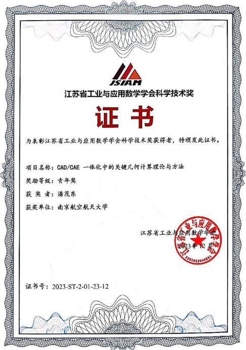 12月23-24日,江苏省工业与应用数学学会2023年学术年会在南京理工大学召开,会上颁发了第六届江苏省工业与应用数学学会科学技术奖。我院潘茂东老师申报的“CAD/CAE 一体化中的关键几何计算理论与方法”项目荣获江苏省工业与应用数学学会科学技术奖-青年奖,并做了题为“面向CAD/CAE一体化的关键几何计算理论”大会特邀报告。