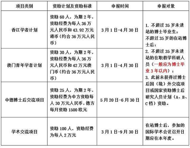 为培养高层次创新型青年人才,加强博士后学术交流与合作,2024年2月22日,全国博士后管委会办公室下发《全国博士后管委会办公室关于开展2024年博士后国(境)外交流项目申报工作的通知》(博管办〔2024〕34号),请各单位在应届博士毕业生、在站博士后、青年教师等群体中广泛宣传和动员,吸引更多优秀博士依托我校申报以上项目,并组织申报。申报一览表如下:
