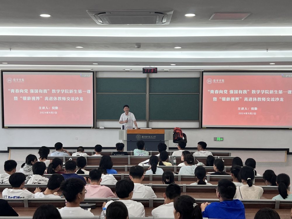9月2日,betway西汉姆联“青春向党,强国有我”新生第一课暨“银龄视界”离退休教师交流沙龙活动在天目湖校区举办。现场邀请到数学学院关工委主席倪勤教授主讲,学院2024级全体新生参与活动。活动由辅导员陈越、赵美婷主持。