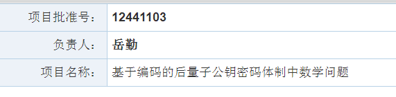 国家自然科学基金委员会数学物理科学部启动的“密码中的关键数学问题”专项项目,旨在发挥国家自然科学基金对解决国家重大需求背后基础科学问题的支撑作用,是针对密码中的数学基础理论和前沿科学问题开展的研究。本年度共资助项目6项。《基于编码的后量子公钥密码中数学问题》项目主要利用具有快速译码算法的线性码,聚焦于三类线性码的编码性质,包括Goppa码,广义Reed-Solomon码和BCH码,以及它们在公钥密码体制中的运用。