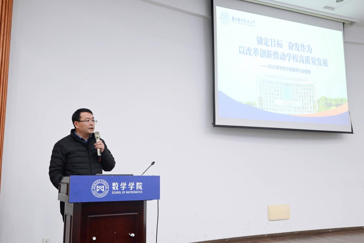 学院院长王春武首先带领大家学习了校长姜斌《锚定目标 奋发作为 以改革创新推动学校高质量发展》的工作报告,着重介绍了学校进一步全面深化改革方案的背景、方向及核心任务。并结合学校重点考核指标及学院2025年十大重点工作,对年度工作任务进行了详细布置,明确了责任分工和时间节点,为学院全年工作指明方向。他表示,2024年学院全面贯彻落实“理科卓越工程”各项任务,在党建思政、科学研究、班子考核等方面取得了显著进步,为学院发展奠定了坚实的基础。2025年作为“十四五”规划收官之年和“十五五”谋篇布局之年,学院要深刻认识全面深化改革的重大意义,清醒认识发展中的短板与瓶颈,凝聚共识、汇聚力量,以高度的责任感和使命感投身改革实践,力争取得更大突破。
