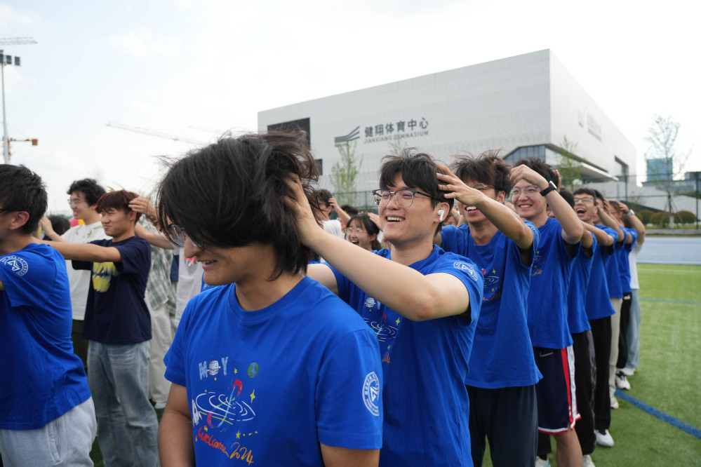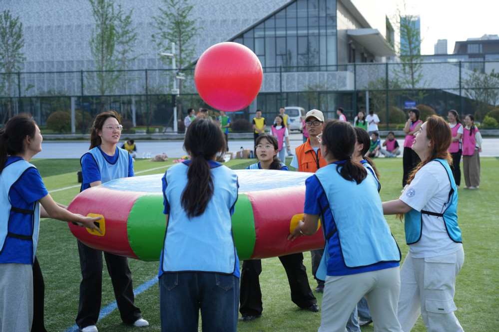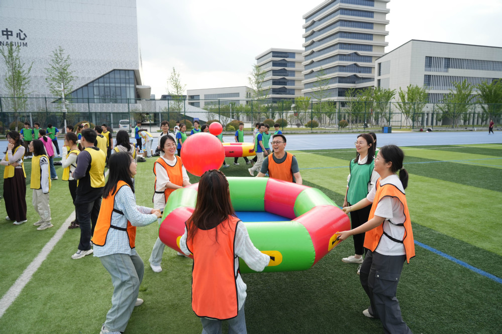 开场环节气氛热烈,师生们混合组成5支参赛队伍。各队在破冰环节集思广益,制定出创意十足的队名和响亮的口号。随后,全体人员跟着教练进行热身,通过团队协作完成指定动作,现场欢声笑语不断。