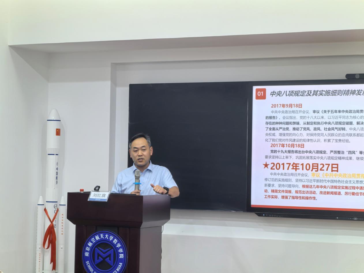 为深入贯彻中央八项规定精神学习教育,持续推进全面从严治党向纵深发展,6月5日,数学学院开展学习教育专题辅导报告会,特邀学校审计处处长刘红旗主讲。学院班子成员、院长助理,系/中心班子成员、支委,机关人员及师生党员代表40余人参加学习,报告会由学院党委书记许静主持。