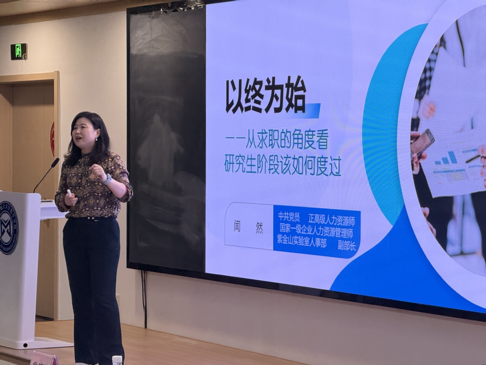 闻然以“以终为始——从求职的角度看研究生阶段该如何度过”为主题,从雇主视角出发,以生涯规划为切入点,向同学们讲授了AI时代背景下,社会和企业对于人才专业和素质的需求。她鼓励同学们紧随时代脚步,提升沟通能力,保持坦诚,保持热爱。