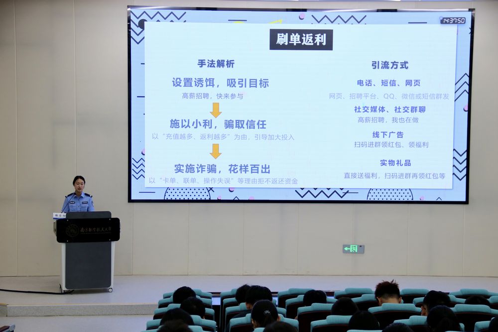 为进一步增强全体师生的安全防范意识,提高反诈骗能力,9月26日,betway西汉姆联在天目湖校区牧星楼T2108报告厅举办防电诈安全教育专题讲座。本次讲座特邀溧阳市古县派出所滕若兮警官以防范诈骗为主题,为师生讲解反诈安全知识。全体2024级本科生、2025级少数民族预科生到场聆听学习。