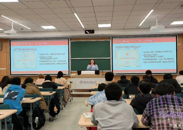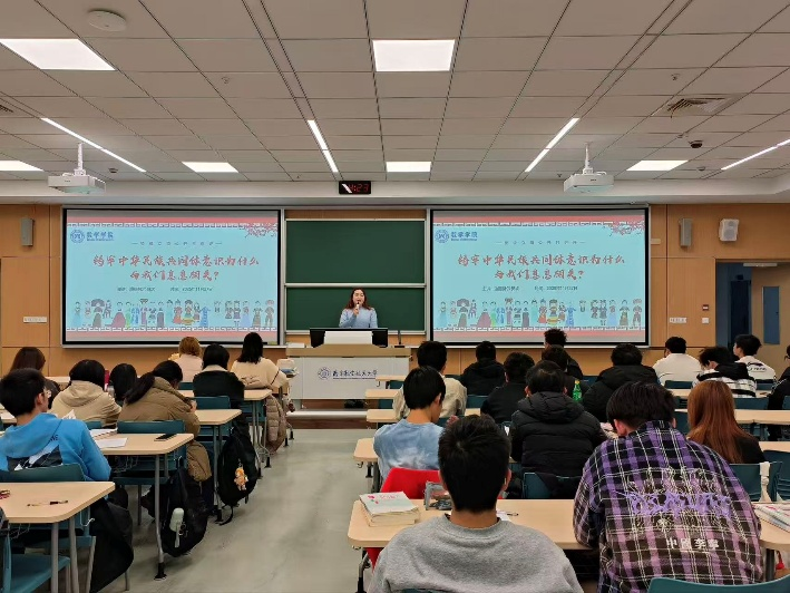 活动伊始,《石榴花开满家园》的视频片段引发学生共鸣,大家围绕“何为家?何为一家人?”展开热议。主讲人以石榴“千房同膜、千子同一”的特质为喻,阐释了中华民族“多元一体”的鲜明特征,从历史溯源、现实案例与个人成长三维视角,结合校园育人实践,深入解读铸牢中华民族共同体意识的丰富内涵与时代价值,引导学生树立“四个与共”理念。