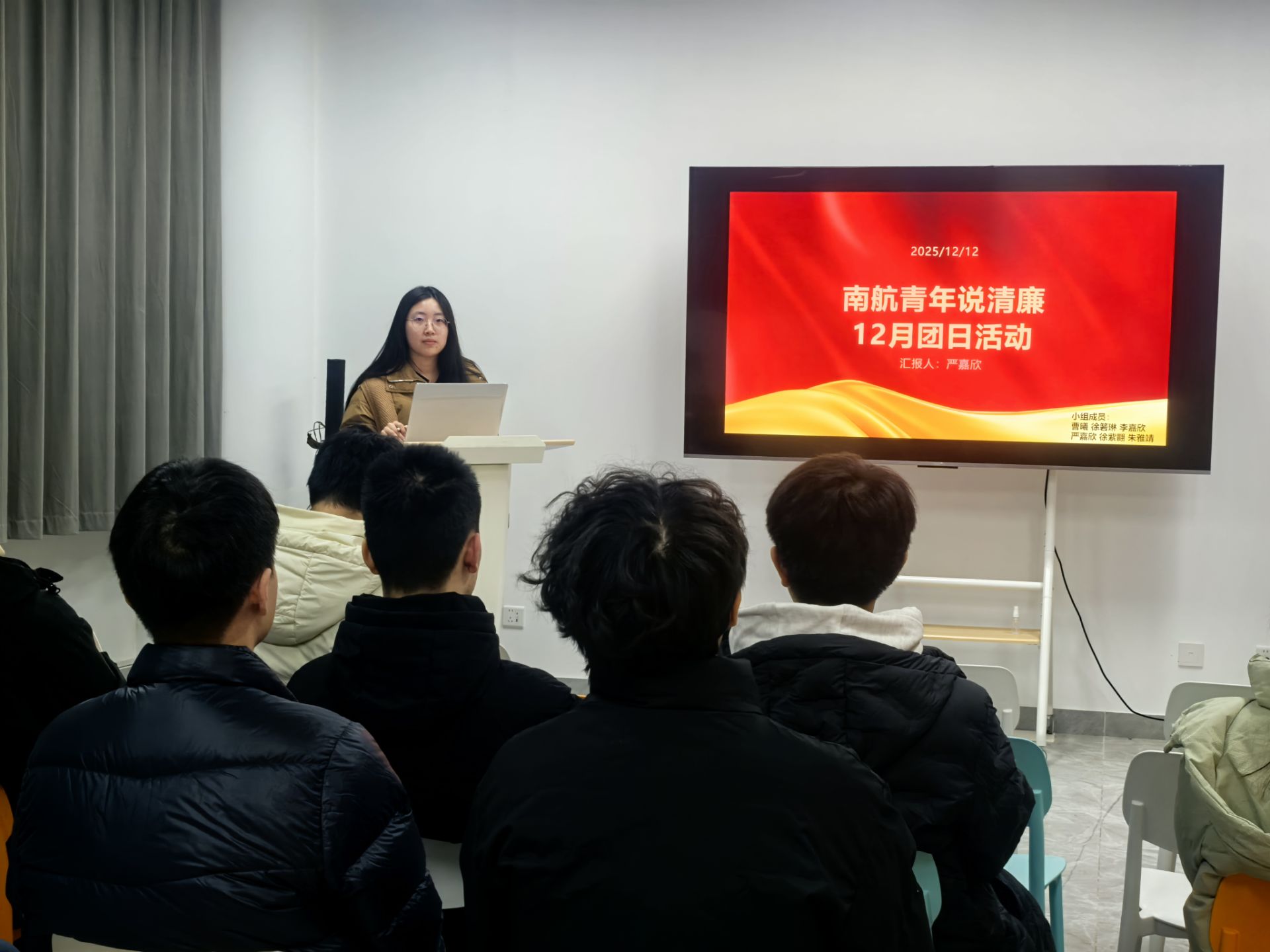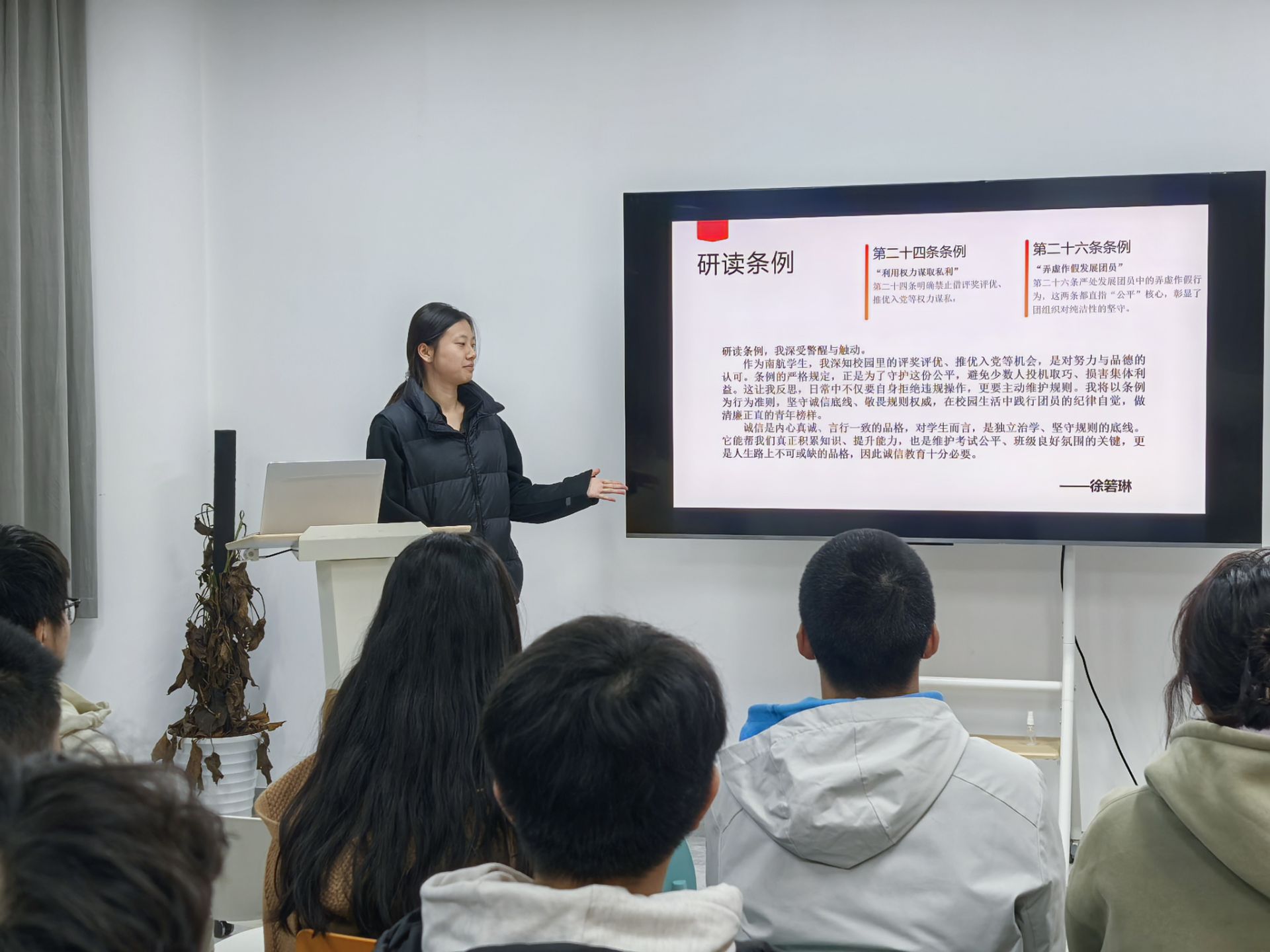 活动伊始,全体成员聚焦《中国共产主义青年团纪律处分条例(试行)》开展学习。0824201班班长严嘉欣分章节对《条例》进行梳理解读,重点分享了对 “利用权力谋取私利”“弄虚作假发展团员” 等条款的理解,并发出倡议:作为南航学子,不仅要自身拒绝违规操作,更要主动维护规则权威。